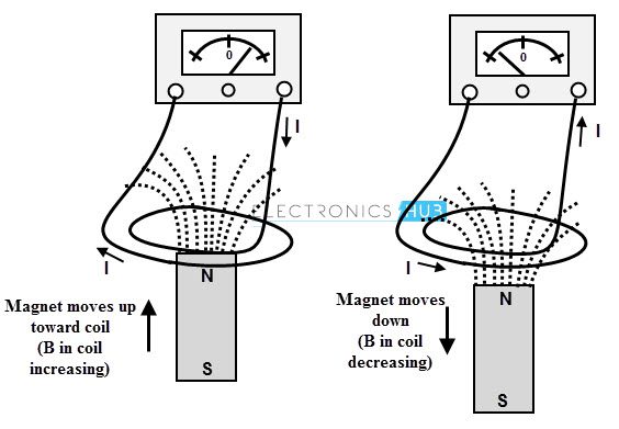 Un imán permanente se mueve de tal manera que las líneas magnéticas a través de la bobina cambian. Entonces las estadísticas del galvanómetro se desvían cada vez que hay un movimiento de imán permanente. Más será la deflexión del galvanómetro cuando el imán permanente se mueva más rápido.